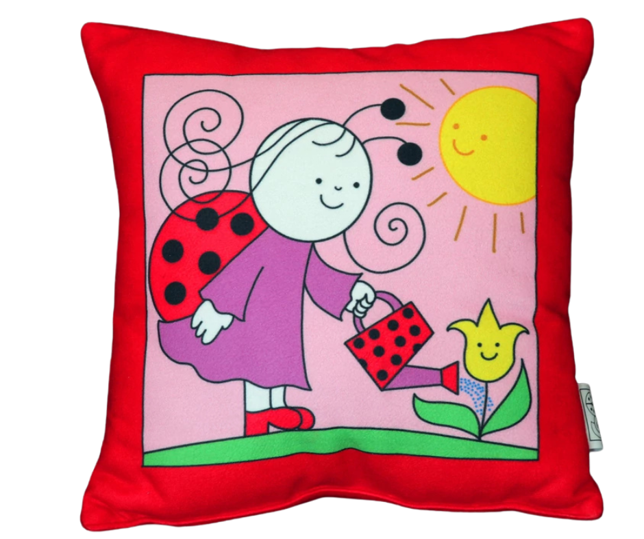 Párna a Bogyó és Babóca sorozat szereplőivel. Babóca, a katicalány grafikáját a sorozat szerzője készítette.