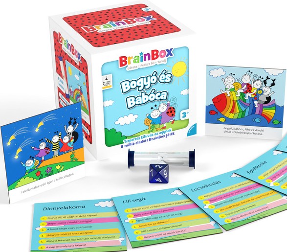 Mit csinál Bogyó és Babóca a kártyákon? A BrainBox - Bogyó és Babóca társasjáték az emlékező tehetséget fejleszti, a gyerekek kedvenc karaktereivel, Bogyóval, Babócával és az erdő többi lakójával. A kihúzott kártyát 10 másodpercig kell memorizálni, és utána olyan kérdésekre kell válaszolni, mint pl. mi van a gyerekek kezében, van milyen színű festékkel fest Baltazár? A kérdésekre helyes választ kell adni, az nyeri a játékot, aki a legtöbb jó felelet adja.
