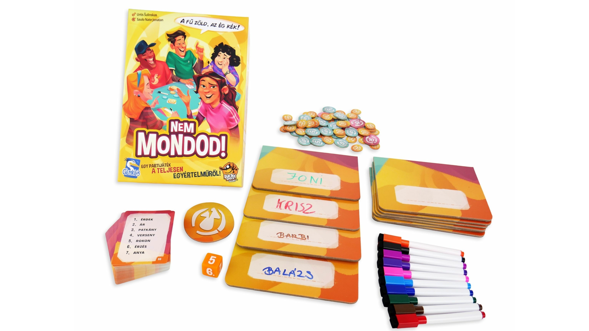 A Nem mondod! pörgős, vicces társasjáték, ahol az agyafúrt egyértelműség visz a győzelemhez. Nem a rejtvényfejtésről vagy logikai csavarokról szól: itt az a nyerő, aki olyan mondatot ír egy adott kifejezésről, hogy abból még egy szó kihúzása után is egyértelműen rá lehessen jönni, mi a teljes mondat.
