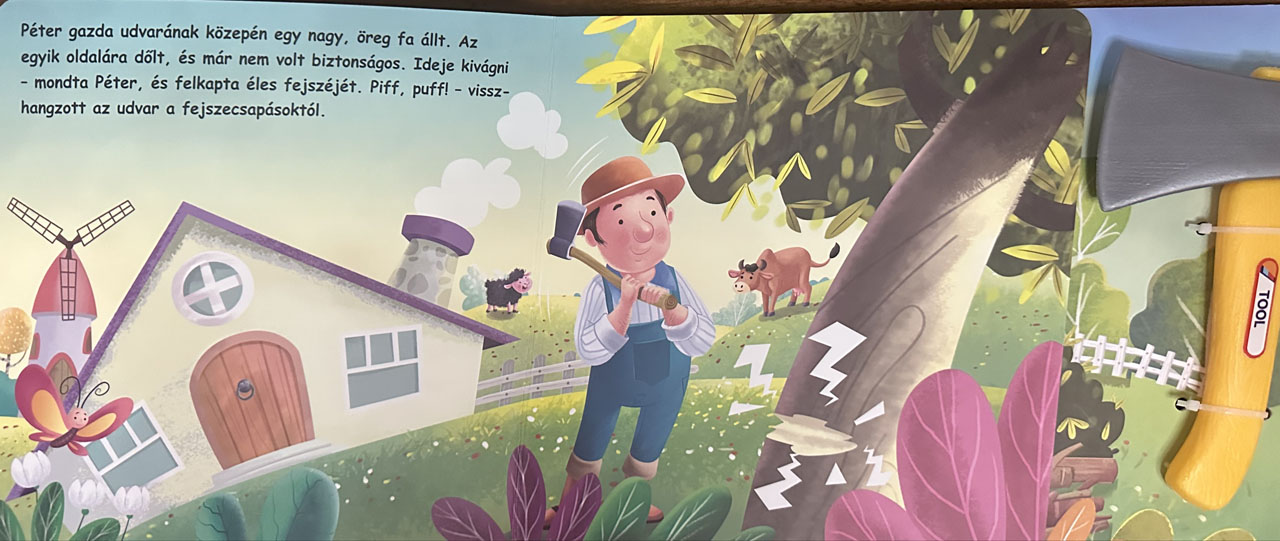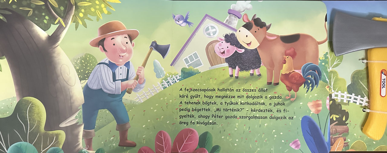A történet egy gazdáról szól, aki egy fát készül kivágni az udvaron, hogy megóvja az állatait. Ugyanis a fa már elkezdett kidőlni és nem halogathatta tovább a munkát. Olvassátok el a történetet, amit ti is eljátszhattok a könyvhöz adott ajándékkal, a játék fejszével!