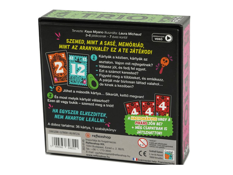 Mennyire jó a memóriád? És mennyire tudsz jól kérdezni? A játék célja, hogy a többieknél gyorsabban gyűjts össze triót (3 ugyan olyan kártyát). Hagyományos mód: szerezd meg bármely 3 triót vagy szerezd meg a 7-es triót. Pikáns mód: gyűjts össze 2 kapcsolt triót (a kapcsolt számok a kártyák alsó sarkában láthatóak). Vagy pedig szerezd meg a 7-es triót. Előkészületek: keverjétek meg a kártyákat, és osszatok belőlük képpel lefelé minden játékosnak a játékos számnak megfelelően. Ezutána megmaradt kártyákat képpel lefelé helyezzétek le egymás mellé könnyen elérhető helyre az asztalra. A kártyáitokat vegyétek kézbe és rendezzétek növekvő sorrendbe anélkül, hogy bárkinek is megmutatnátok. Ha te ettél legutóbb avokádót akkor nyertél, te leszel a kezdőjátékos! A kör az óramutató járásával megegyező irányba halad. A saját körödben kártyákat kell felfednek egyesével. Ha 2 különböző számú kártyát fedsz fel, akkor meg kell állnod. Viszont ha két egyformát fedsz fel, akkor felfedhetsz egy harmadikat is. Kártyát kétféleképpen fedhetsz fel: Az asztalról felfordítasz egy tetszőleges kártyát vagy egy játékos kezéből (akár sajátból) viszont ekkor figyelned kell arra, hogy csak a legkisebbet vagy a legnagyobbra kérdezhetsz rá. Ha sikerült három ugyanolyan számú kártyát felfordítanod, akkor helyezd őket magad elé. Majd a következő játékoson van a sor. A játékot az nyeri, aki leggyorsabban megszerzett 3 triót vagy a 7-es triót!