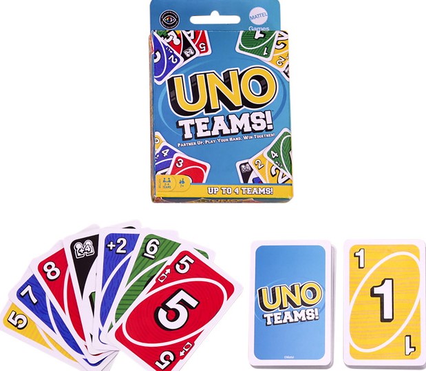 Az UNO Teams megduplázza a klasszikus UNO izgalmait. A cél nem változott, a játékosok még mindig színre-színt, számra-számot vagy szimbólumot rakhatnak, de ahelyett, hogy mindenki a saját győzelméért küzdene, párokban játszanak a győzelemért. A speciális kártyák és szabályok segítik a csapattársakat az együttműködésben, és a győzelemhez mindkét játékosnak meg kell szabadulnia a kezében lévő összes kártyától - és persze az utolsó kártyához érve nem szabad elfelejteni azt kiáltani, hogy "UNO!"